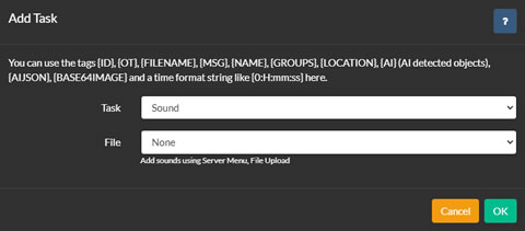 Agent DVR 작업의 Then 필드에 있는 태그를 사용하여 동적 응답을 생성할 수 있습니다. 일부 태그는 컨텍스트에 따라 다르다는 점을 유의해야 합니다. 예를 들어, {FILENAME}은 경고 이벤트에는 사용할 수 없으며, {AI}는 AI 서버에서 생성된 이벤트가 아닌 경우에는 사용할 수 없습니다.