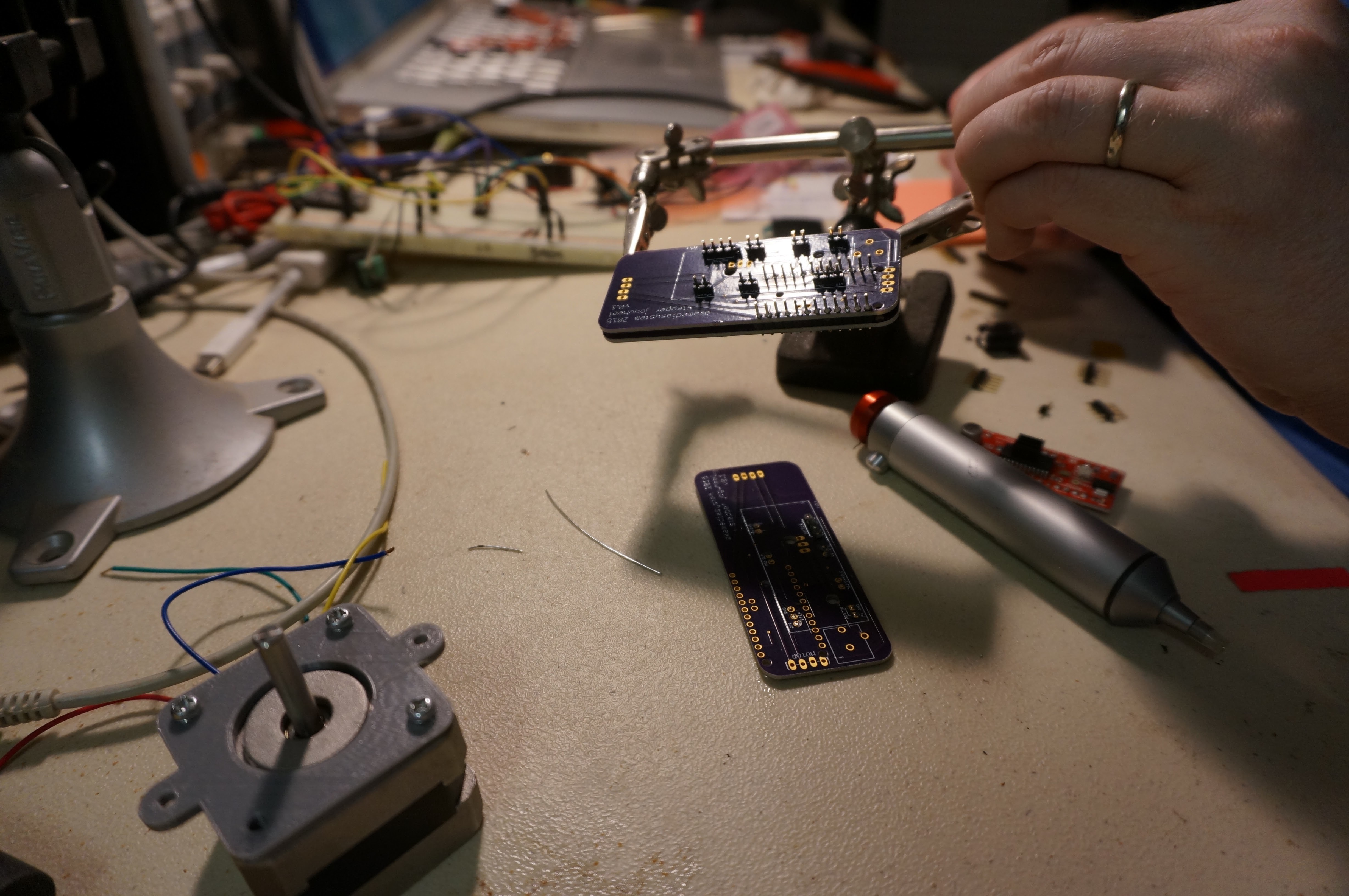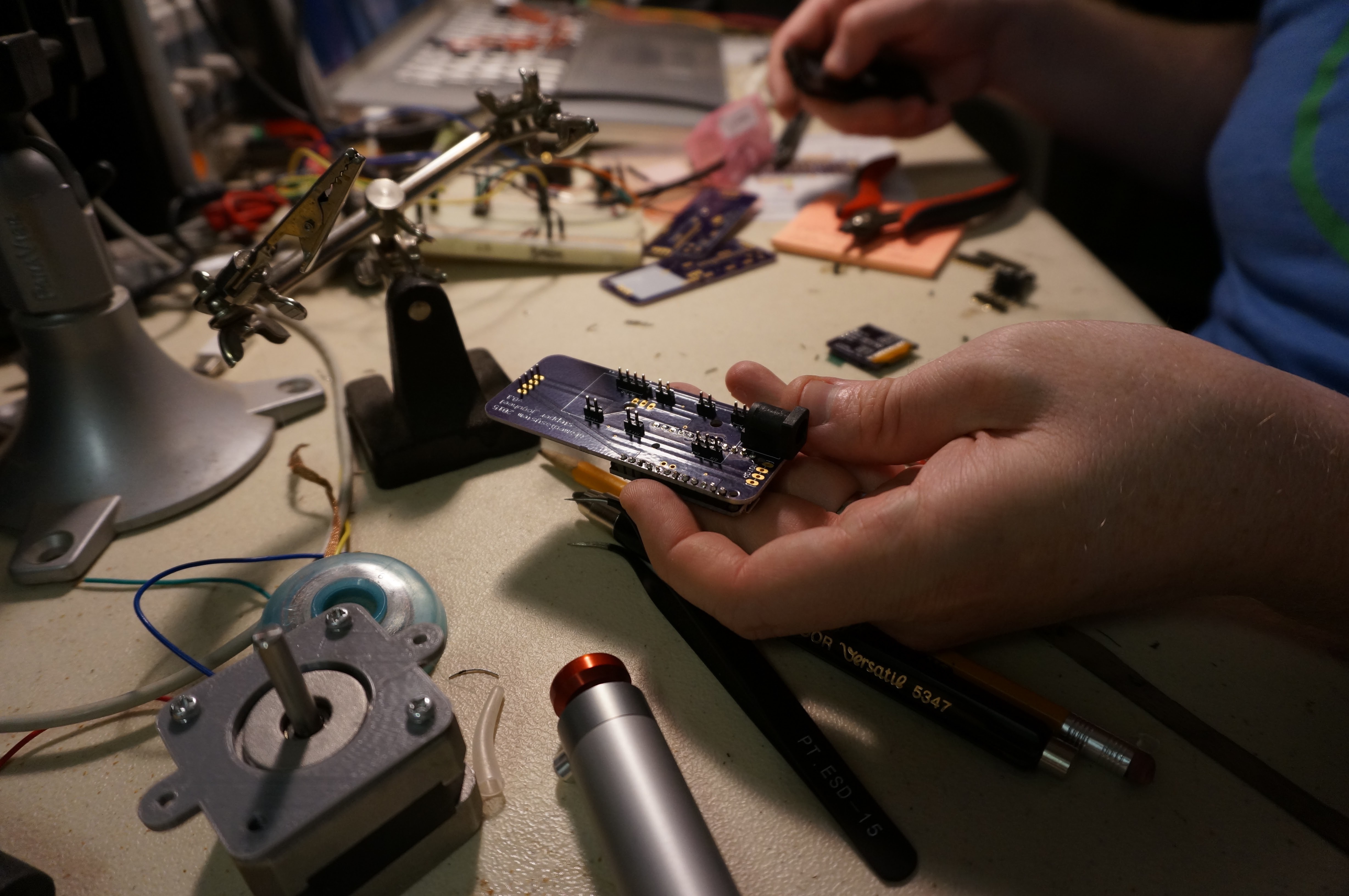 Getting the headers to stay in straight is a bit of a challenge. I used an extra, unpopulated PCB and some alligator clips to hold them straight; you can see the extra board and how I'm holding the piece in this photo: