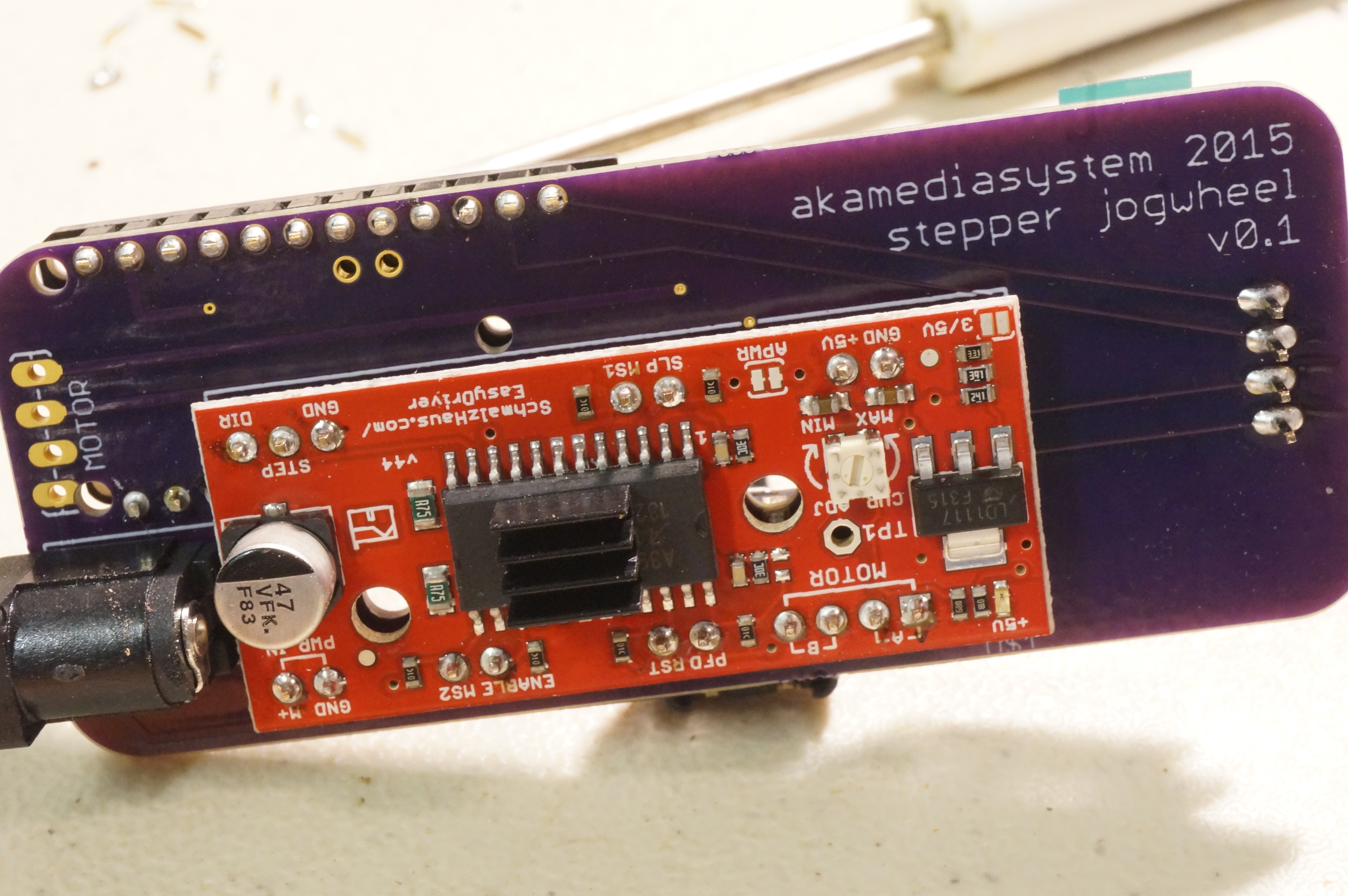 The correct way to assemble is to solder all the headers to the PCB first. The plastic part of the header should, in each case, be directly under the daughterboard (the OLED, the EasyDriver, and the Pro Trinket). Here is a photo of the headers in place:
