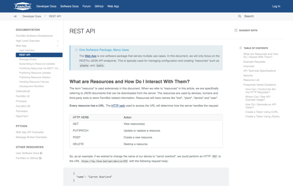 Creating a developer-friendly platform is the next extensibility goal for FarmBot. By creating a set of documents that can be easily understood by developers we hope to enable an ecosystem of third party plugins and applications that allow users to do more with their FarmBots. We look forward to your feedback.