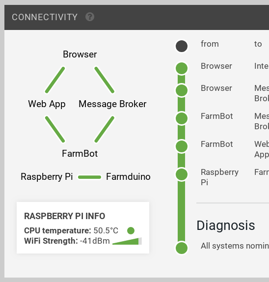 A few of you have expressed interest in additional status information from your FarmBots to be displayed in the Web App. We’ve added a Raspberry Pi information display to the Connectivity widget that shows: