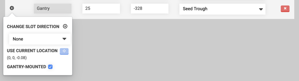 You may have seen the gantry-mounted seed troughs in our launch video for FarmBot Express. To support these types of "slots" that move with the gantry, there is a new option in the tool slot settings menu to define a tool slot as "Gantry-mounted". This will change the X coordinate value to "Gantry", and you'll see the slot rendered accordingly in the farm designer map.