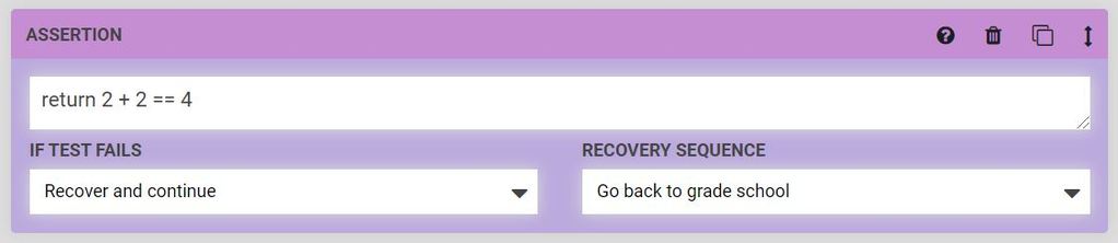 If you're familiar with automated software testing methodologies, you'll be right at home with the assertion command. Simply write an assertion in Lua, and then specify what FarmBot should do if the the test fails. Options include Continue, Recover and Continue, Abort and Recover, and Abort.