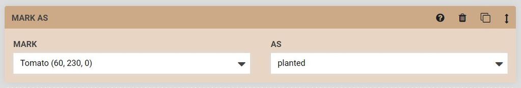 The Mark as command allows you to systematically change the state of objects in your FarmBot with your sequences. For example, you could mark your tomato plant as planted at the end of your seeding sequence: