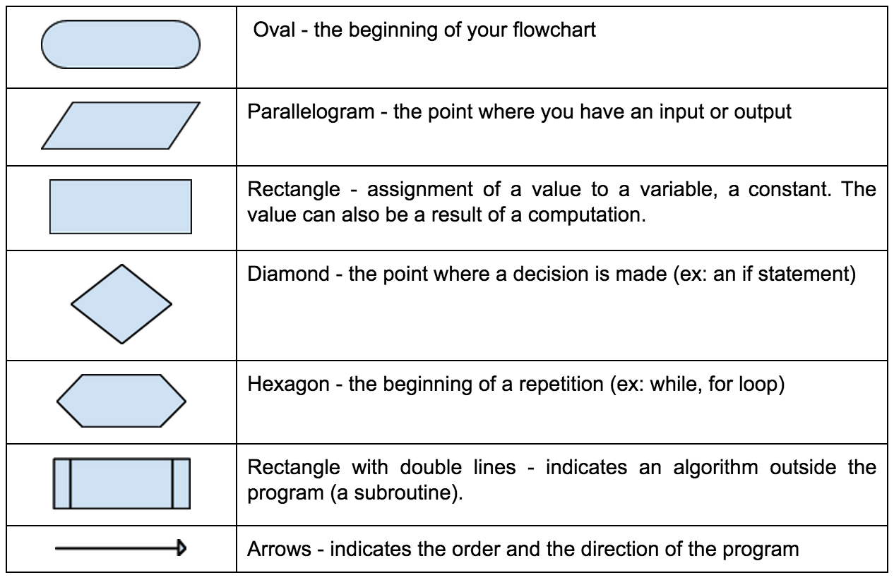 A flowchart represents your program flow from top to bottom. Each command is represented on this. Depending on the nature of the command there are different shapes you can use. A few of them that I mostly use (you can google more on this, google is your friend when you know what to google for) are: